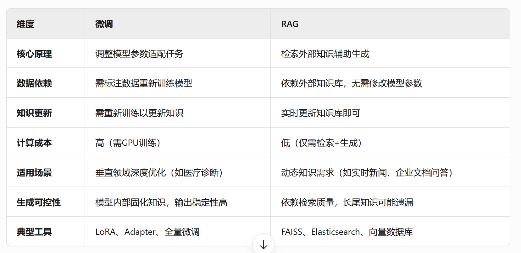 微调微调的本质是参数优化,通过少量数据调整预训练模型的权重,使其适应新任务,固化专业知识或固定流程的领域(如医疗报告生成、法律合同审核)。微调直接修改模型能力,而RAG通过外部知识库检索补充答案,两者在知识更新成本、响应速度上形成互补。需要注意的是微调可能会产生把之前模型具备的某种能力调成更差的情况。RAG和微调的区别详见下图