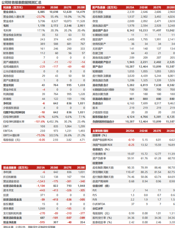 25年全年公司毛利率为17.11%,同比-1.52pcts,净利率为-0.08%,同比-7.22pcts。毛利率降低主要由于低毛利率的固定支架占比提升所致,净利率降低主要由于1)公司为推进全球化战略,在沙特、迪拜及欧洲等全球多地布局多中心、分支机构与海外区域总部,推行属地化人才搭建和本地化运营,相关投入较大,使得期间费用维持高位,对当期利润构成压力;2)汇率波动对公司的外币收入折算及财务费用产生影响。期间费用率方面,25年公司期间费用率为13.14%,同比+5.04pcts,其中管理费用率、财务费用率分别为5.65%、1.63%,同比+2.49pcts、+1.23pcts。