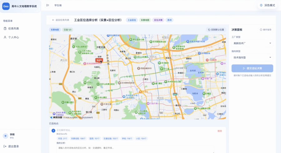 于是她萌生了这样的想法:能不能让学生在地图上为工厂选址、亲手“摆放”工厂,然后立刻得到AI的反馈?于是,她把这个需求带来了“公益黑客松”,找到了志同道合的产品经理和工程师,将这一创意变成了可交互的演示版本。