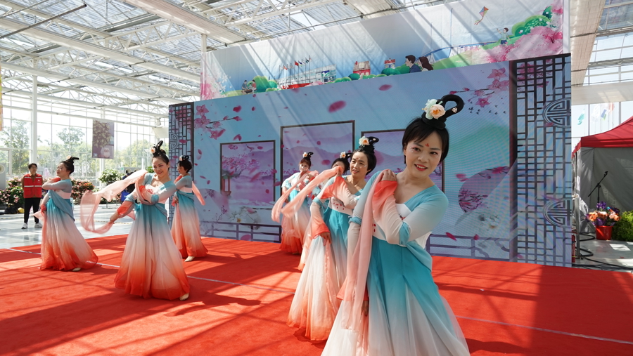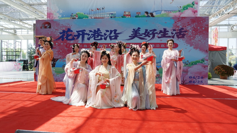 走进源怡花园景区,空气中已弥漫着淡淡花香。开幕式在一支古风舞蹈《一梦惊鸿》中拉开帷幕,8位舞者身着汉服,衣袂飘飘,将传统国风之美演绎得淋漓尽致。全场最高潮的环节当属“十二花神纳福”。十二位演职人员身着不同朝代风格的传统服饰,化身梅花、杏花、桃花等十二位“花神”,以走秀形式依次登场。衣裙翩跹、步态优雅,引得现场游客纷纷举起手机。“以前只在电视里看过花神巡游,没想到如今在家门口就能看到,孩子特别开心。”来自港沿镇本地的居民黄女士告诉记者,她和家人特意早早赶来,准备好好感受一下这场“家门口的花朝节”。